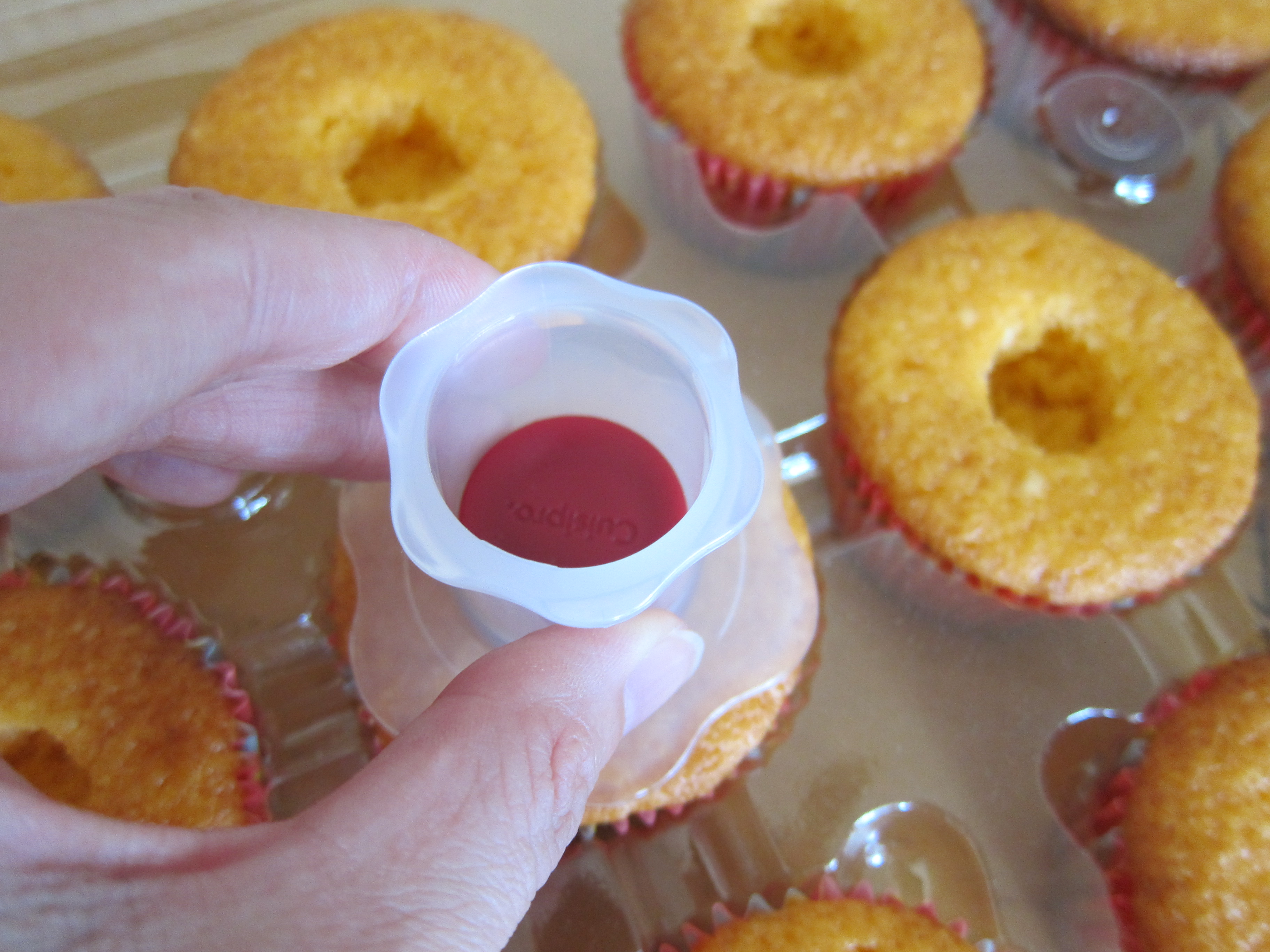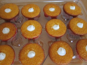 I recently bought a cupcake plunger. It’s a plastic doohickey that removes the center of a cupcake so it can be filled with all kinds of yummy stuff. No, I didn’t NEED one – a knife works just as well – but it looked like it would be a fun gadget to have. I got to use it today while I was making some orange cream cupcakes.