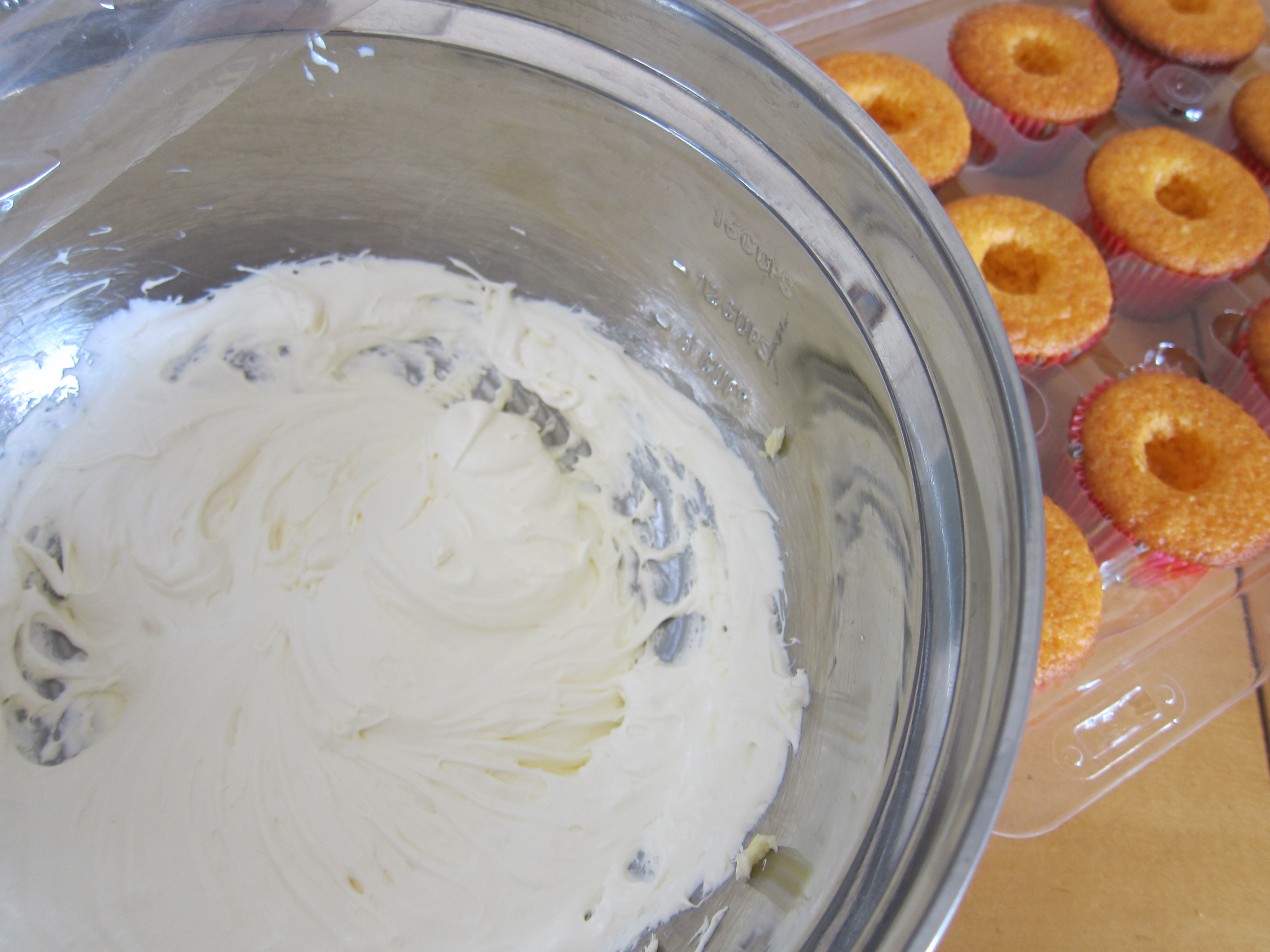 I spooned the cream into a pastry bag with the tip cut off (after I finished taste testing…I think I’m going to dip some strawberries in the leftover cream!) and filled all the cupcakes.