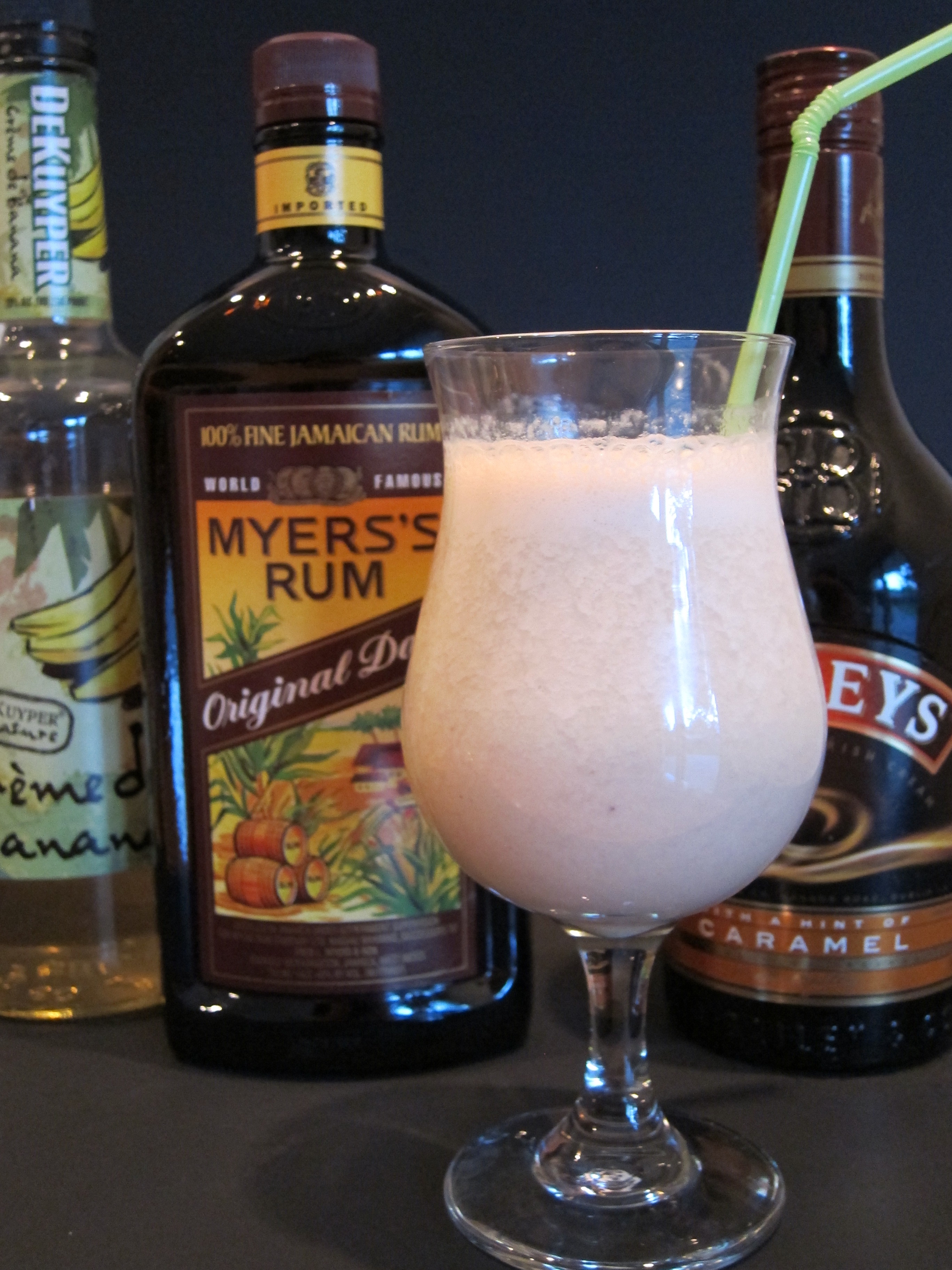I had some bananas ripening on top of the fridge that I needed to do something with and lots of rum leftover from the Rum and Coke cupcakes, and since I am off from work tomorrow and Tuesday (woohoo! four day weekend!) I decided to mix up a new cocktail.  It’s really good.  The only problem is that I don’t know what to call it.