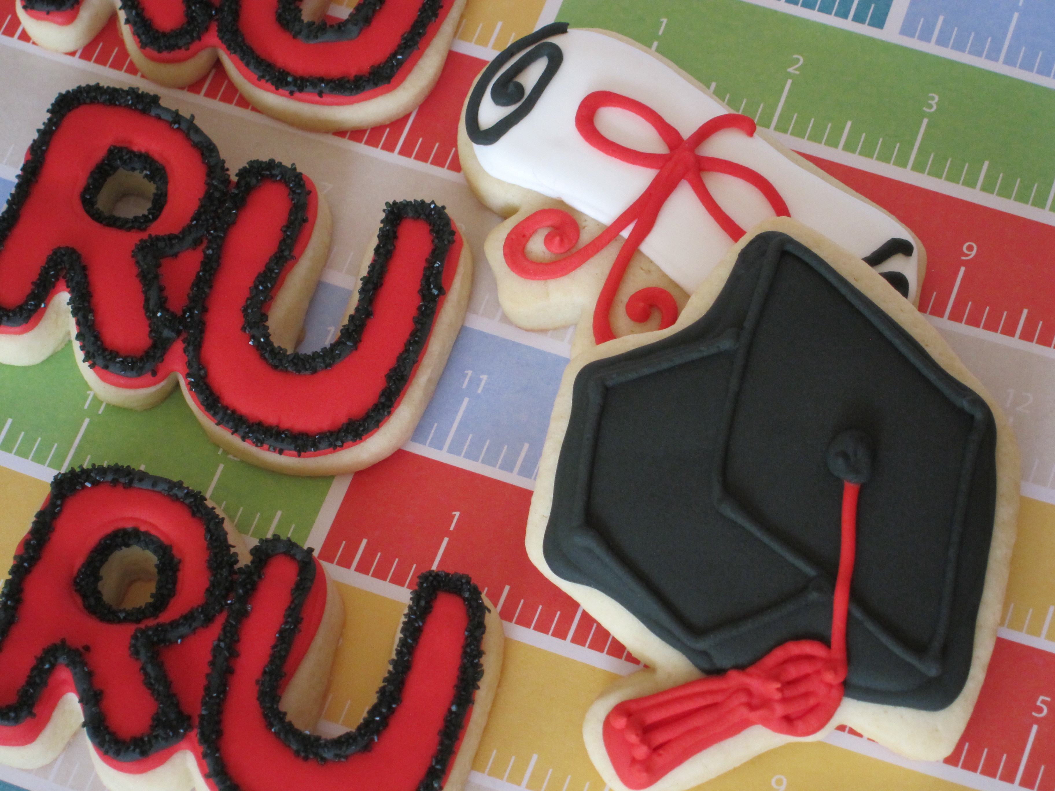 A coworker asked me to make cookies for her sister who is graduating from Rutgers University. Being a Rutgers grad myself, I thought it would be pretty fun to make this set. I used a tutorial from The Sweet Adventures of Sugarbelle for the basic design of the caps and diplomas. I had originally planned on just doing the letter R for the logo cookies but I had forgotten how tiny the letters in my alphabet cookie cutter set are. The little “R” looked so small and forlorn next to the other cookies that I decided to added the “U” to bump up the size a bit.