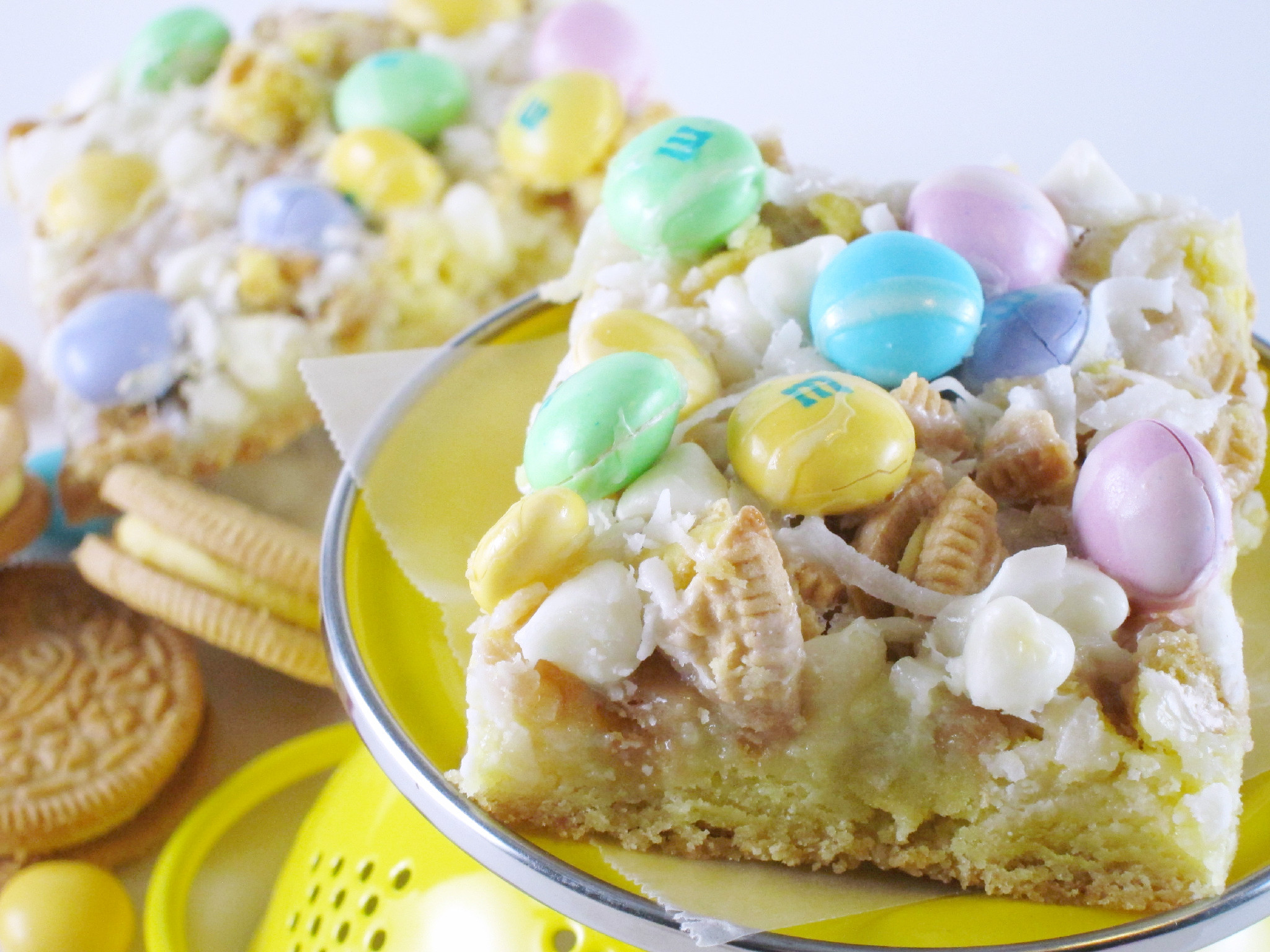 Hi all! Is it finally starting at act like spring where you are? I think the temperature here in NJ actually got above 60 degrees today! Of course, it’s supposed to be all crappy and rainy today but that’s okay because I just baked a batch of sunshine last night. 🙂 Lemon cake, coconut flakes, Lemon Creme Oreos, pretty pastel White Chocolate M&M’s. These Lemon Coconut Magic Bars look like spring and taste like summer!